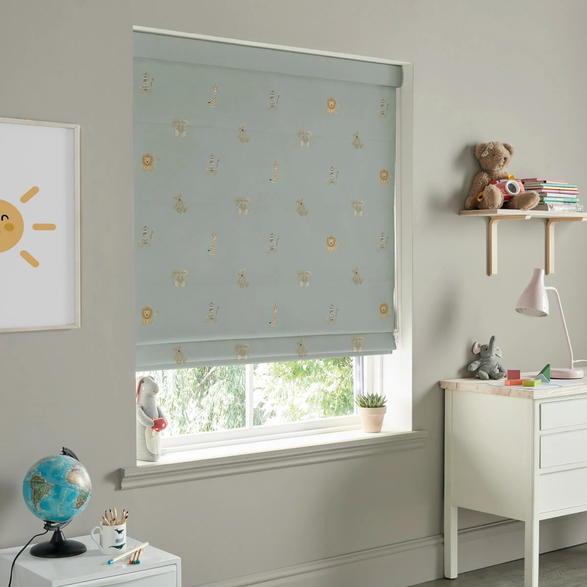 Excellent for blocking the light when they go down for a daytime nap or evening snooze. Perfect for children’s rooms or nurseries, this adorable roman blind features Sophie’s Bears & Balloons design, which is covered in safari animals with cute giraffes, lions, zebras and teddy bears on a sage green ground.