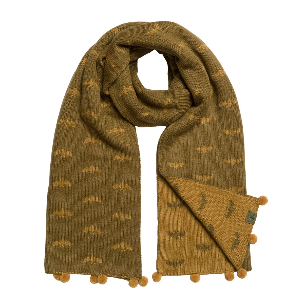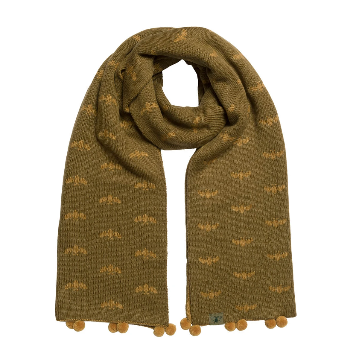 Wrap up warm with this beautiful knitted scarf, which is covered in buzzing mustard yellow bees on a tan ground. The pompom detailing finishes off this cosy scarf which would make a great gift and matches perfectly with the Bees Knitted Hat.Â