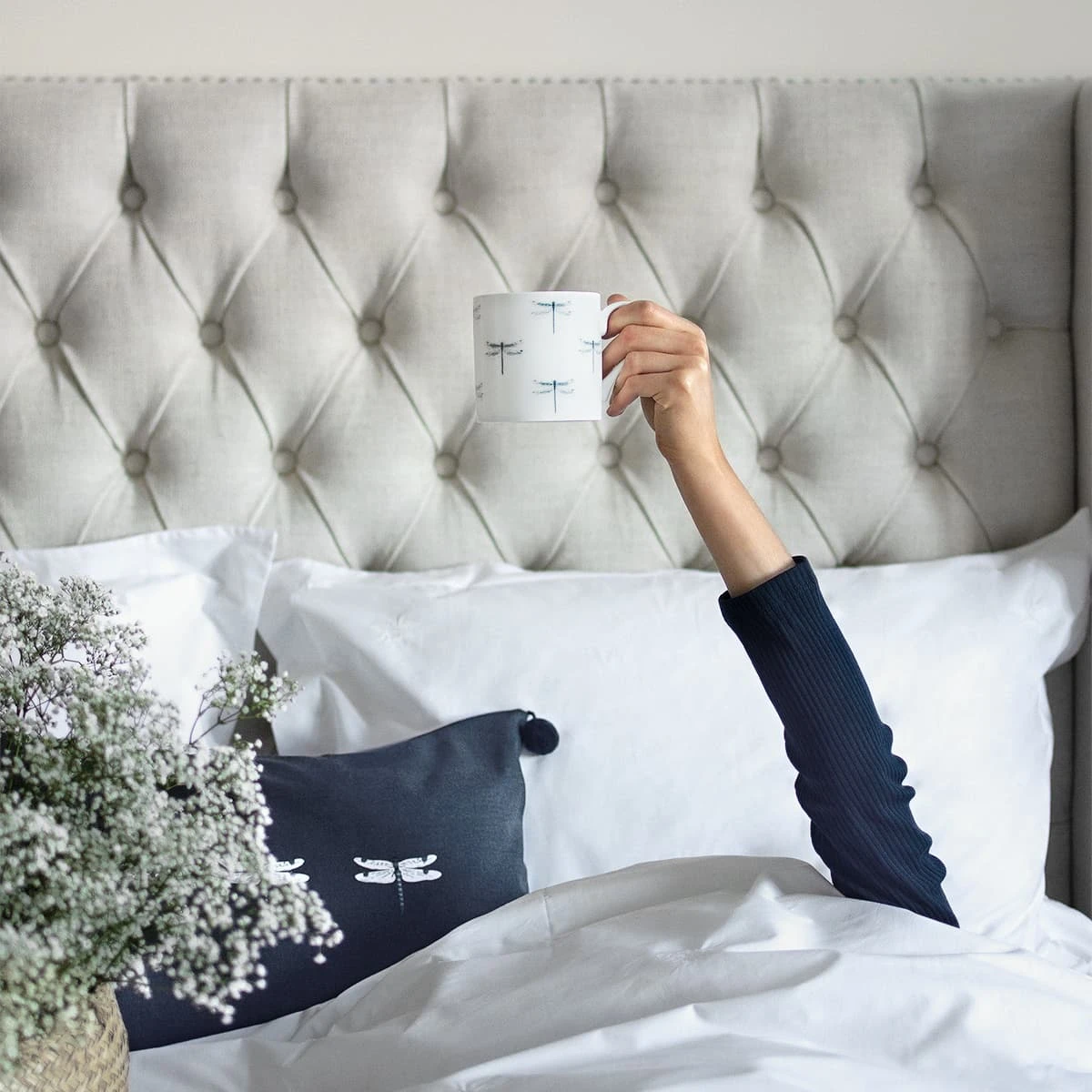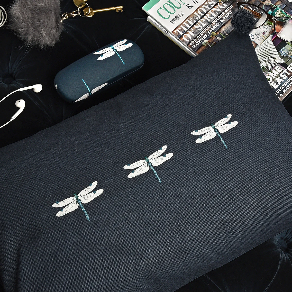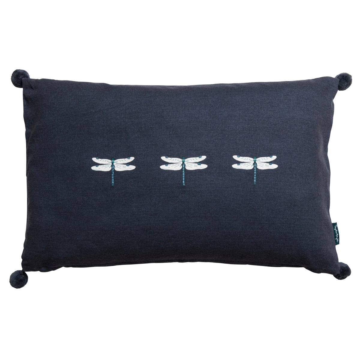 Three striking embroidered dragonflies sit centrally against the contrasting midnight blue background, on this stylish decorative cushion. It’ll look lovely in a sitting room or bedroom and is finished with small pompom corner detailing.