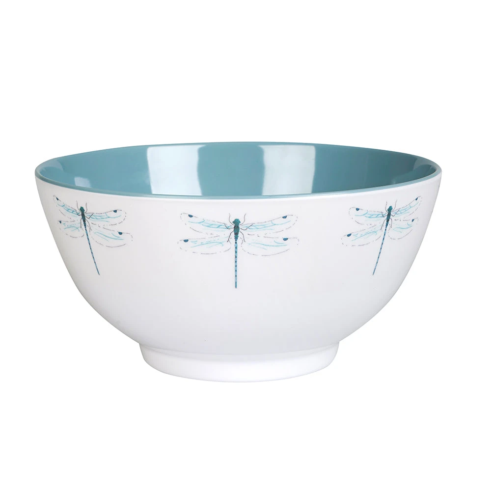 Regal dragonflies flitter around the edge of this melamine bowl – ideal for kids in the garden or family picnics over the summer. The contrasting dusky blue inner coordinates beautifully with the whole Dragonfly picnic collection.