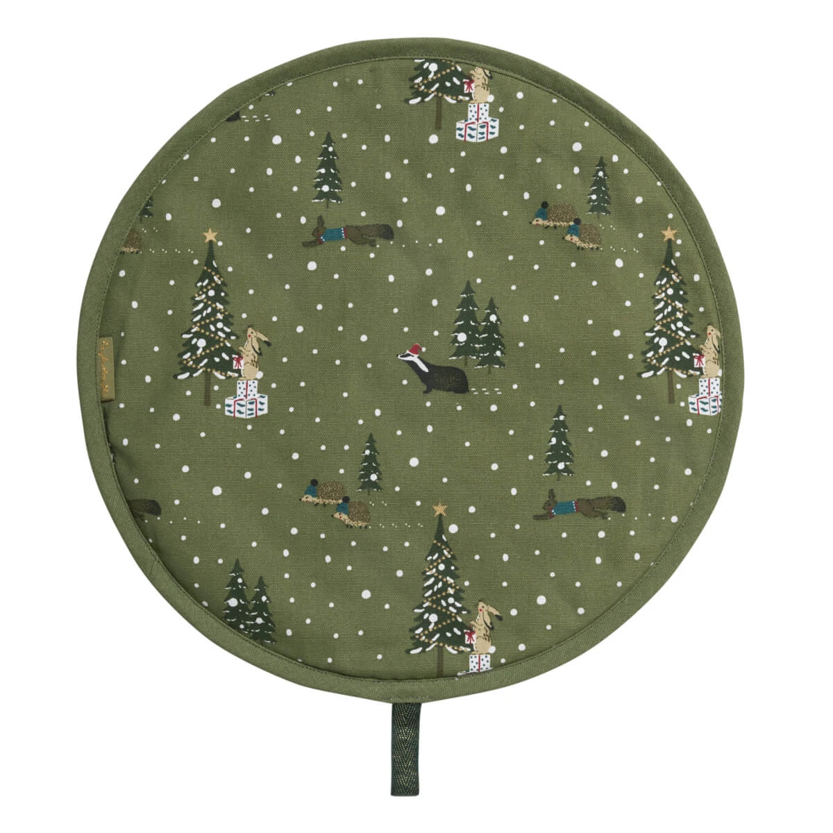 Perfect for keeping your prized hobs clean and free from scratches, these round hob covers are covered in Sophie’s magical Festive Forest design on a rich olive background. Excellent for adding a festive touch to any kitchen. Dotted with hedgehogs, badgers, hares and squirrels in a snowy festive forest. Made from 100% cotton with a terry towelling base, and features a handy loop so they can be easily attached to the handle on your cooking stove. We don’t recommend placing piping hot pans directly onto the cover.