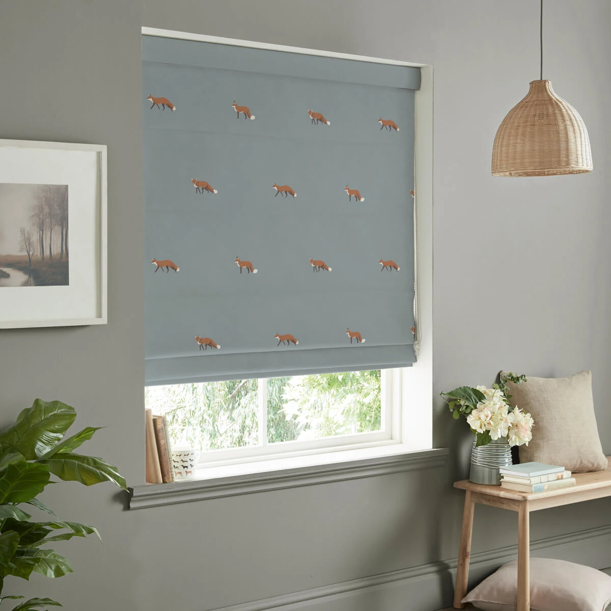 Add a touch of the country to your home interior with this luxurious teal roman blind which is covered in charming foxes. Perfect for brightening up any window and adding a luxurious and elegant feel to your home.