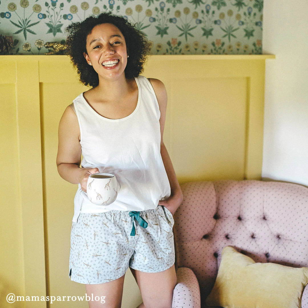 Excellent for summer, these lovely pyjama shorts are made from a lightweight cotton and have practical pockets and a handy tie front. Perfect for wildlife enthusiasts, the stylish design features Sophie’s fabulous giraffes on a giraffe print background.