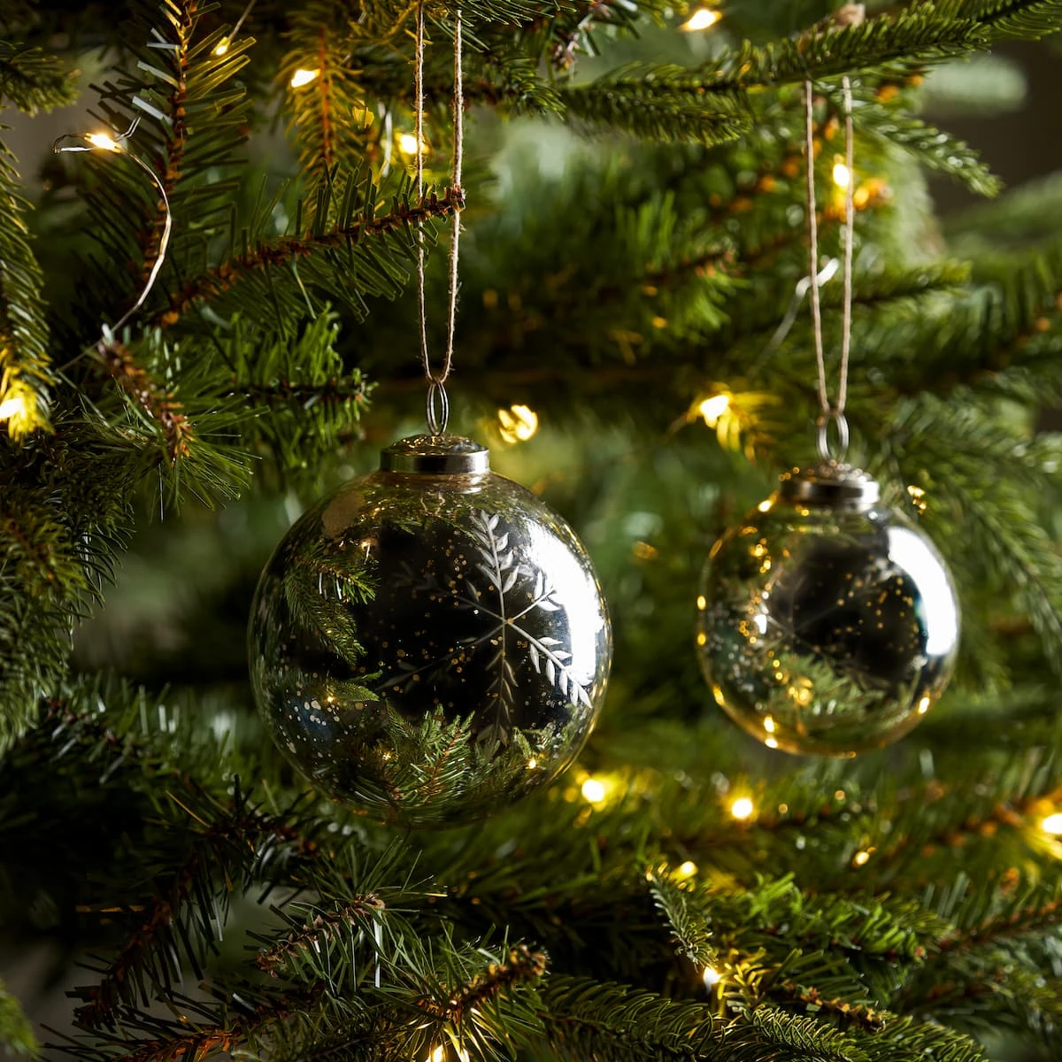 Add a touch of seasonal sparkle to your home this Christmas with these beautiful Glass Silver Snowflake Baubles. Boasting an antiqued silver finish and delicately etched snowflakes on either side, this decoration comes in two sizes and is sure to make a stylish yet festive statement. Complete with a twine hanging loop; so you hang on your tree, tie to wreaths and garlands, use as table decorations or simply hang around your home over the festive period.