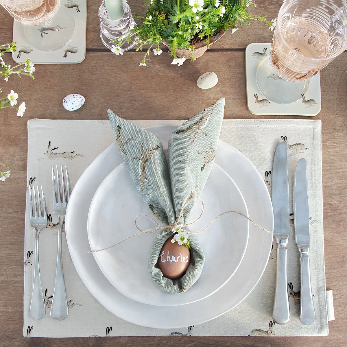 Decorate your dining or kitchen table with these lovely fabric placemats in our Hare design. They feature brown Hares racing over a stone coloured background. A neutral print that will coordinate with most interiors. They make it so easy to turn an ordinary breakfast, lunch, or dinner into a slightly more special event. They’d also smarten up a summer dining table outside too. The fabric is glue bonded together to make the placemat sturdy, so is better ‘wiped’ clean rather than immersing it in water. The reverse of the placemat is plain stone coloured.