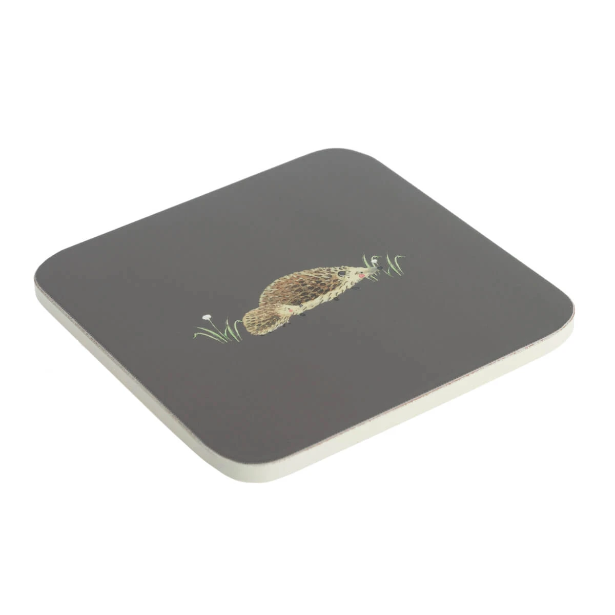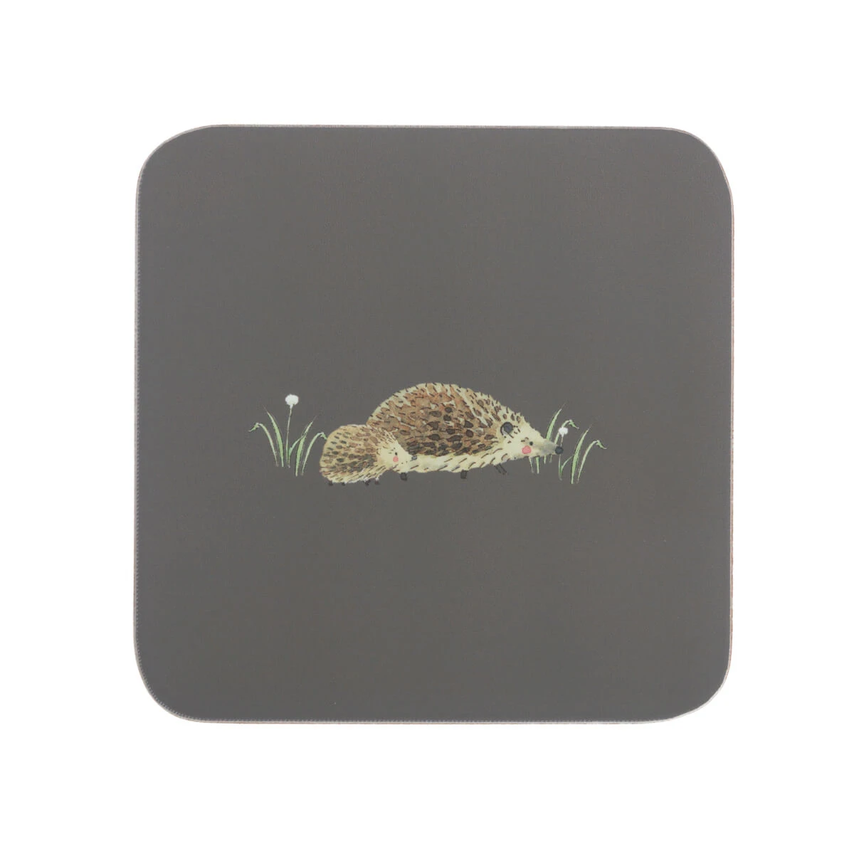 This set of four coasters features Sophie’s illustration of a charming, rosy cheeked hedgehog and its hoglet strolling across a charcoal grey background. It makes a wonderful gift idea for those who love hedgehogs and wildlife.
