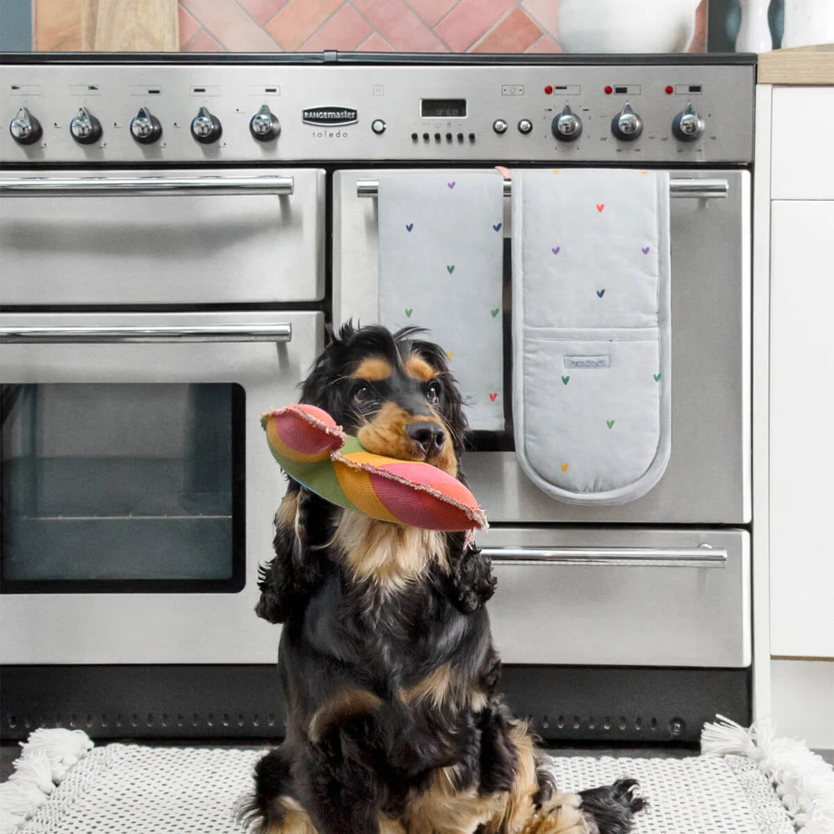 A beautiful cotton tea towel covered in colourful hearts on a neutral grey background. A wonderful way to add some love to your kitchen and makes an excellent gift idea, perhaps pair with the matching apron and double oven glove from the Hearts collection for the complete look.