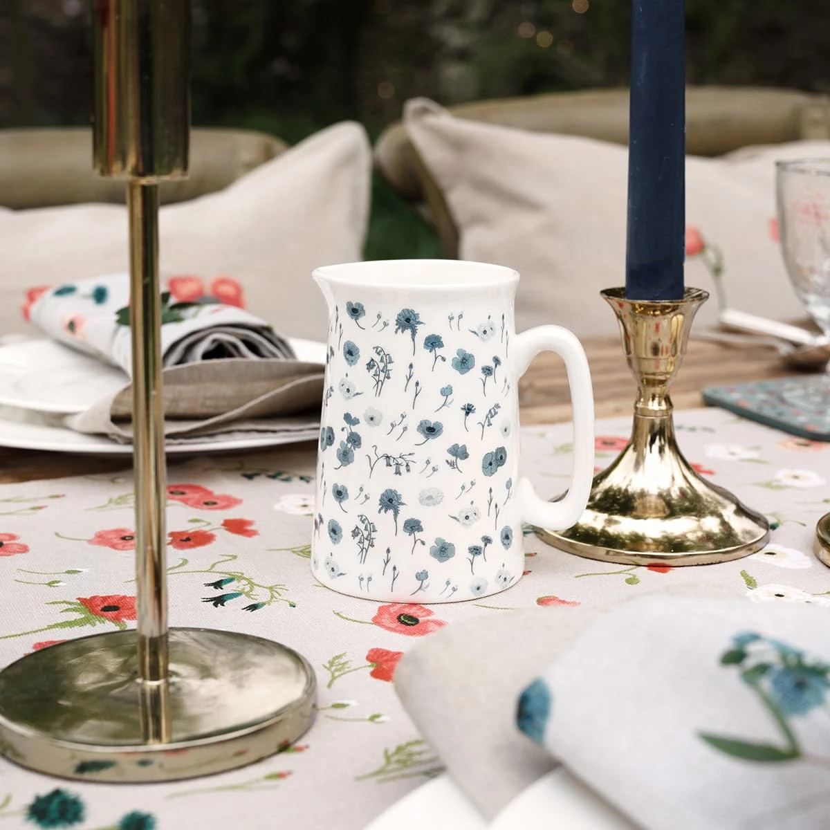 A beautiful floral small jug, made from fine bone china, which makes a wonderful kitchen accessory. Perfect for sauces, milk and cream or use as a small vase with cut off flowers from your garden. This stunning jug features delicate pale blue illustrations of blossoming poppies, delicate British bluebells, cornflowers, and an abundance of buds ready to burst.Â