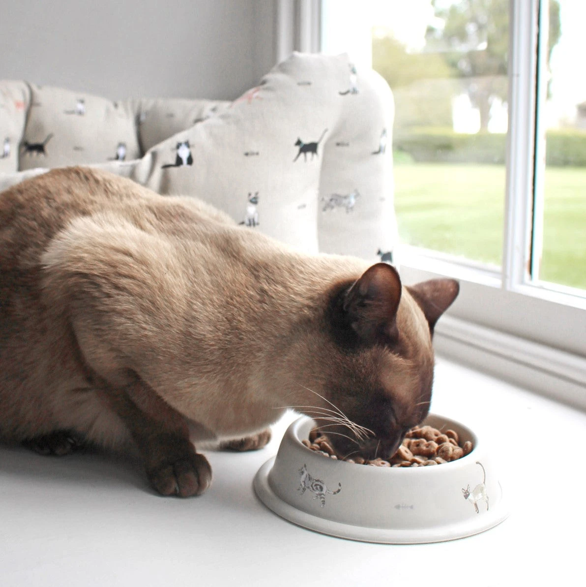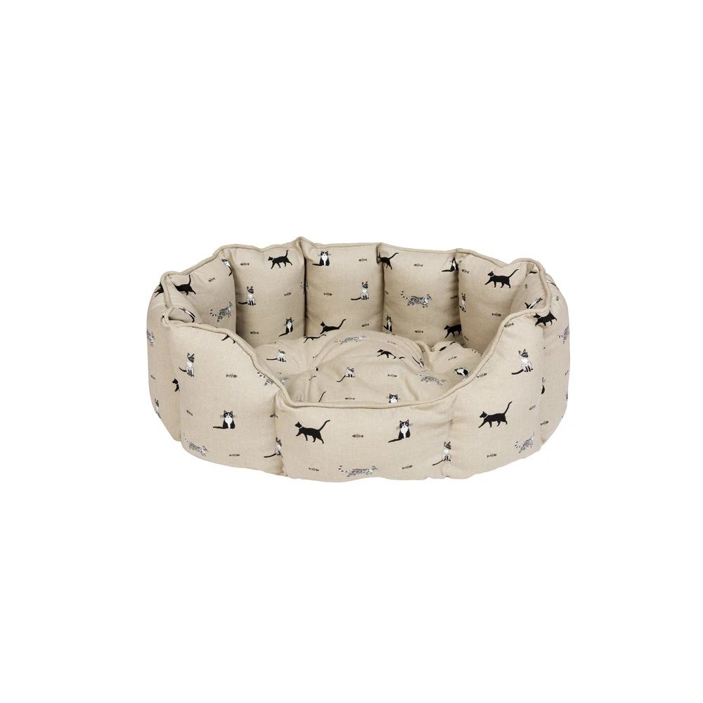 Our oval-shaped cat pet bed features deep filled fibre shoulders for enhanced comfort with drop down front for easy access. A super cosy bed for your cat to curl up in. Made from our hard wearing cotton ‘Purrfect’ cat fabric it is covered in black, tabby, Siamese, ginger and black & white cats on a wheat beige background. There are some fun grey fish bones dotted between the cats.
