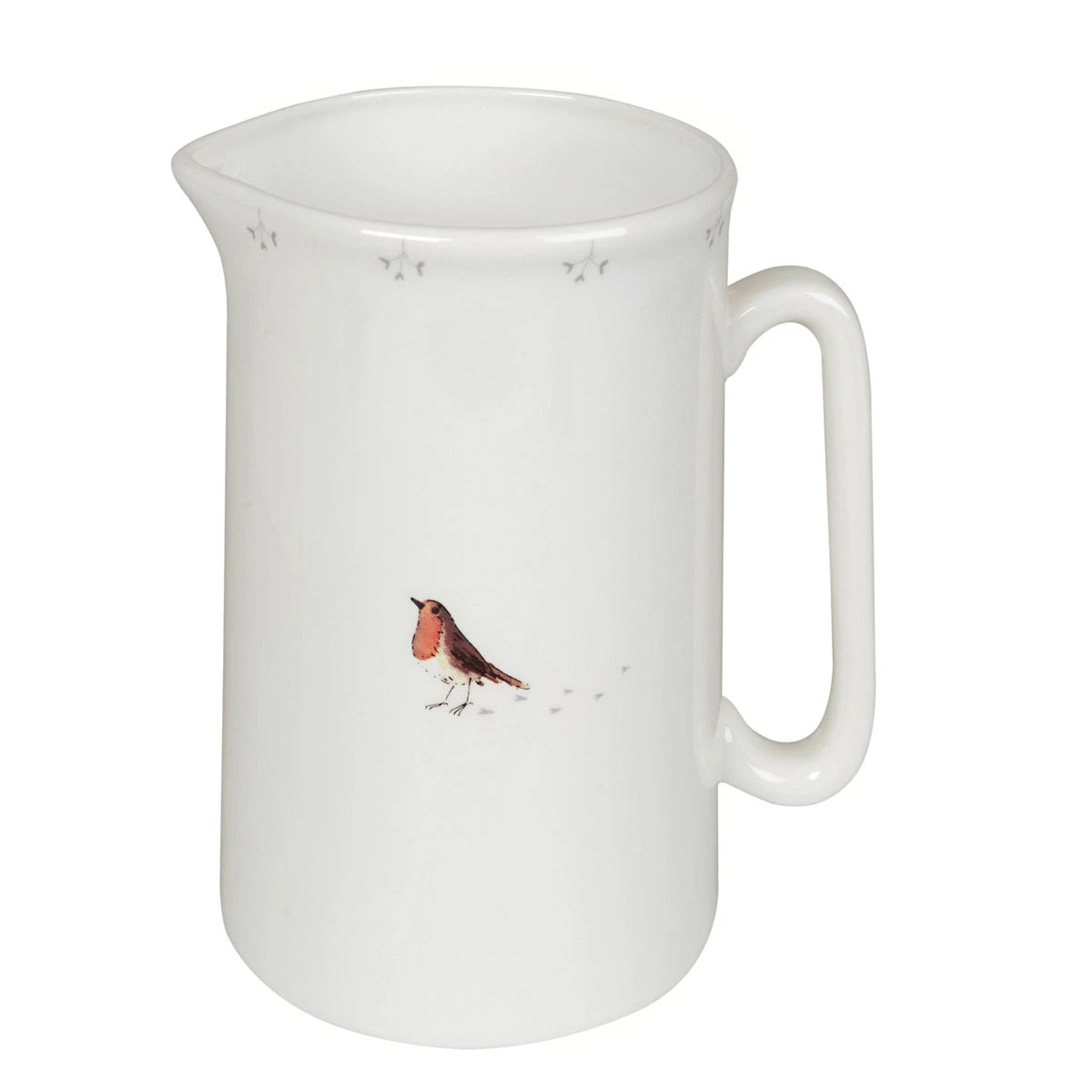 A red-breasted Robin stands on the front and back of these fine bone china white jugs. There are some sprigs of mistletoe around the top rim of each jug. Available in four sizes – mini, small, medium, and large.