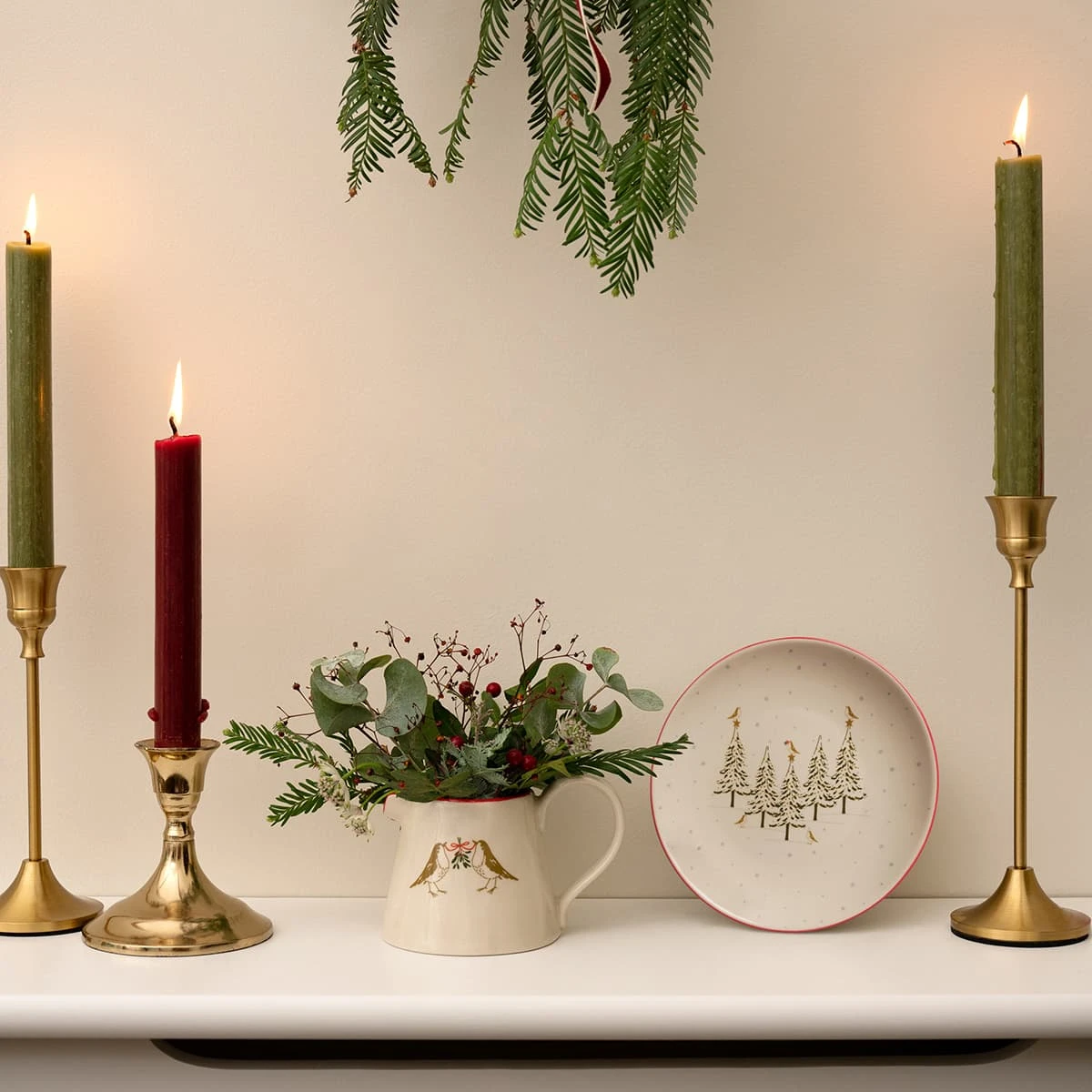 Perfect for serving your mince pies, this lovely stoneware side plate is dotted with adorable plump Robins perching on top of Christmas trees with one Robin holding a sprig of mistletoe against the snowy neutral background and contrasting red rim. Measuring 20cm in diameter, this lovely plate makes a wonderful small canape plate or side plate for any stylish Christmas table setting.Â