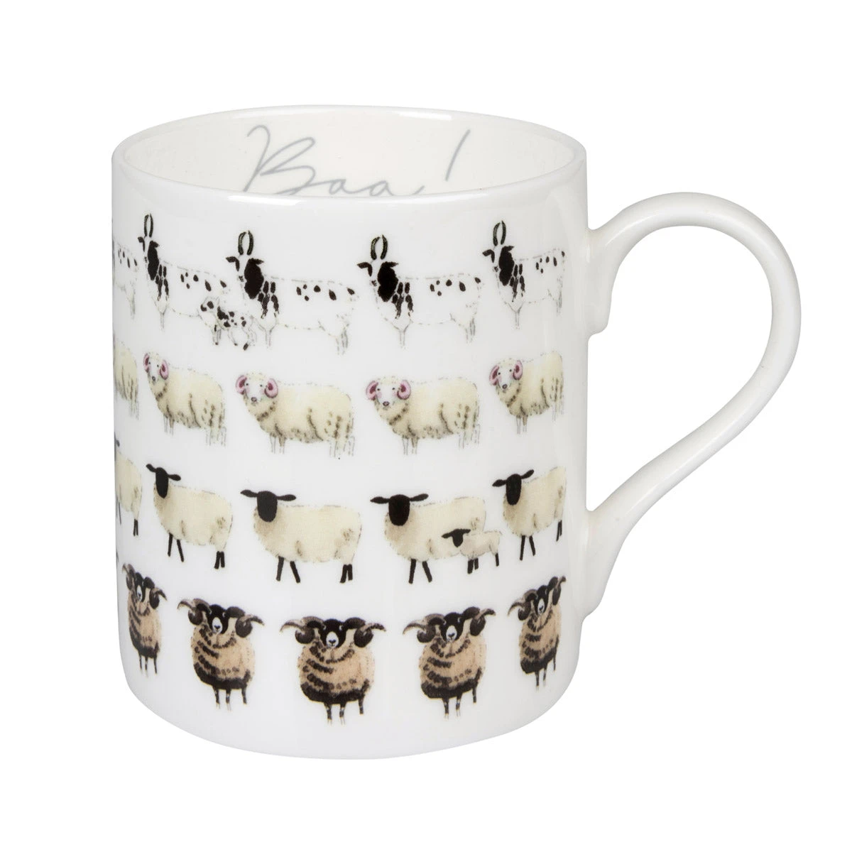 This gorgeous fine bone china mug is covered in sheep! Lots of different breeds including the Suffolk, Scottish Black Face and Jacob. Can you spot the baby black lamb?