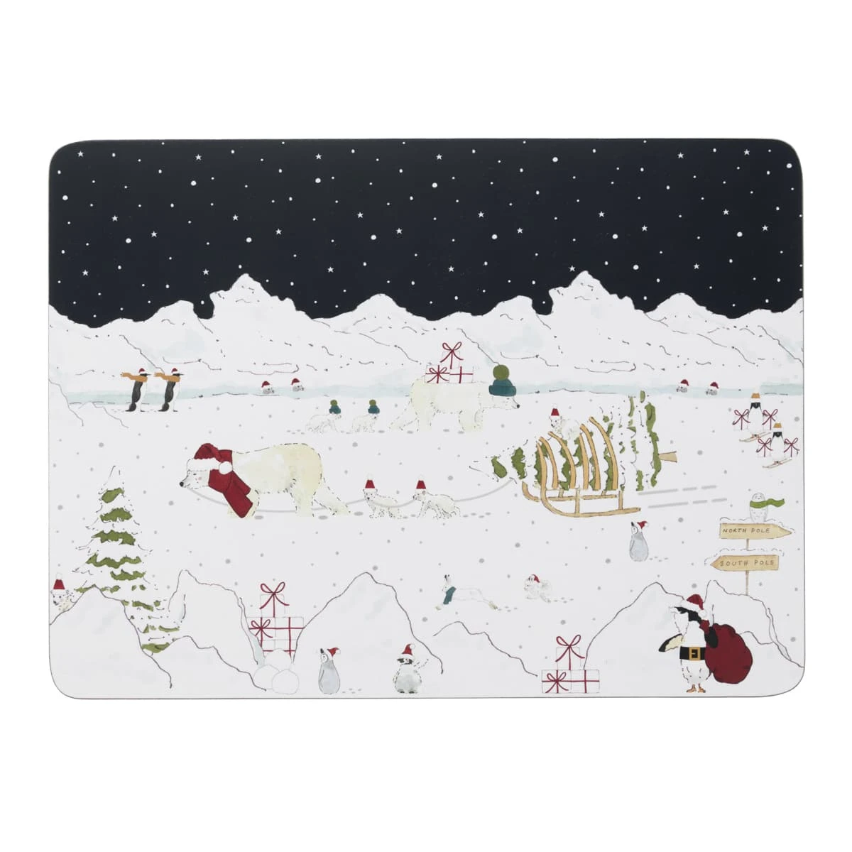 This set of four cork placemats features our super festive Snow Season design. A heart-warming design perfect for adding festivities to the home this season. These cork placemats feature adorable polar bears and their cubs, artic hares and penguins all wrapped up warm in scarves and Santa hats playing around the Christmas trees, building snowmen and carrying presents on a white snowy ground under the night sky. A practical and super stylish way to protect your table surface from stains, spillages and water rings during the Christmas chaos. They would make a lovely little Christmas gift.