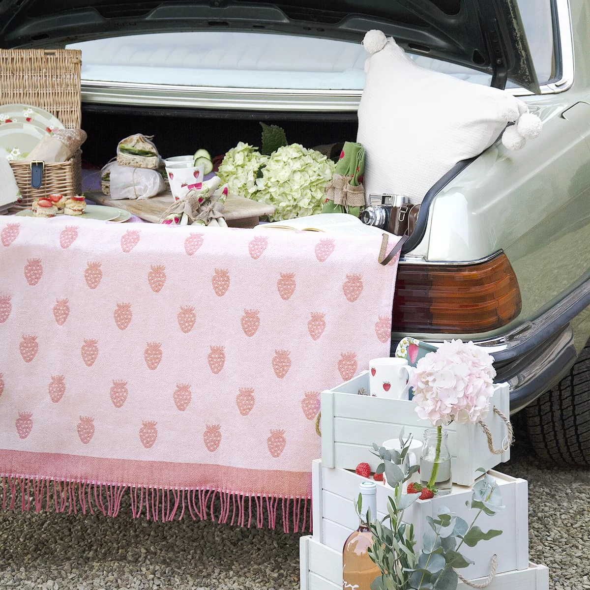 Make picnic and beach trip memories sweeter with this practical and stylish picnic blanket from our Strawberries collection. Featuring Sophie’s strawberries silhouettes on a blush pink ground colour, it is perfect for family days out or taking a snooze in the sun. The faux leather straps make it easy to carry around, whilst the water-resistant backing is perfect for keeping you dry if the ground is wet.Â