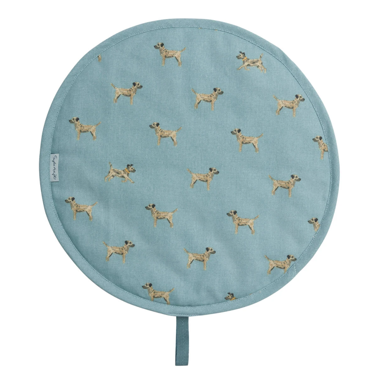 An adorable design perfect for dog lovers. This round hob cover with loop features border terriers on a beautiful teal ground colour and is excellent for keeping your cooker tops clean and scratch-free, as well as keeping in the heat. Excellent for adding a pawsitive touch to any country kitchen. We don’t recommend placing piping hot pans directly onto the cover.