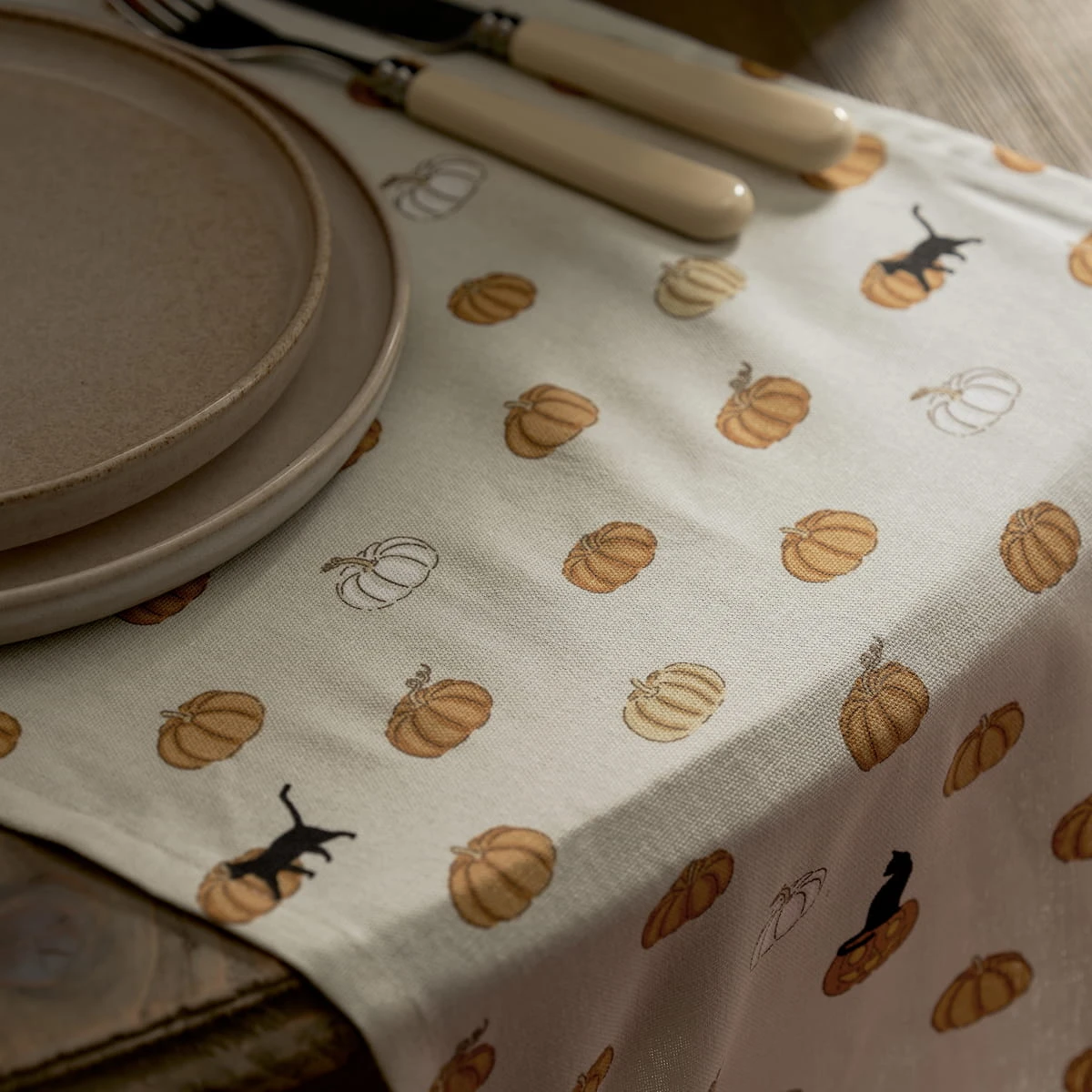 Bring the nostalgic excitement of this time of year to your Halloween table setting or autumnal dinner party, with this stunning Trick or Treat Table Runner. Featuring Sophie’s hand drawn illustrations of golden orange pumpkins and sleek black cats on a neutral ground, this table runner has instant impact in any interior. Sophie’s Trick or Treat design is perfect for giving your kitchen and dining space a seasonal feel, whether preparing a hearty homemade pumpkin soup or hosting a dinner party with friends and family.