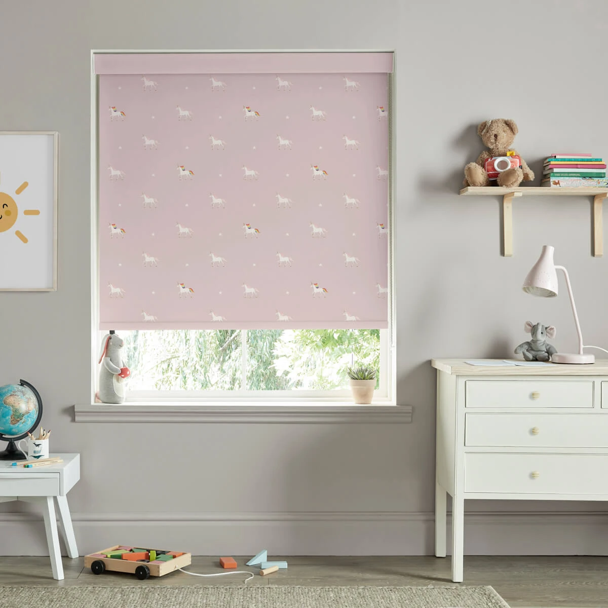 Radiant unicorns trot gracefully across a soft pink coloured background on this magical roller blind. Luscious manes and tails are a decadent candyfloss pink, with the occasional magical rainbow unicorn to be spotted. Perfect for anyone who loves unicorns, it’s sure to add sparkle to any children’s bedroom.Â