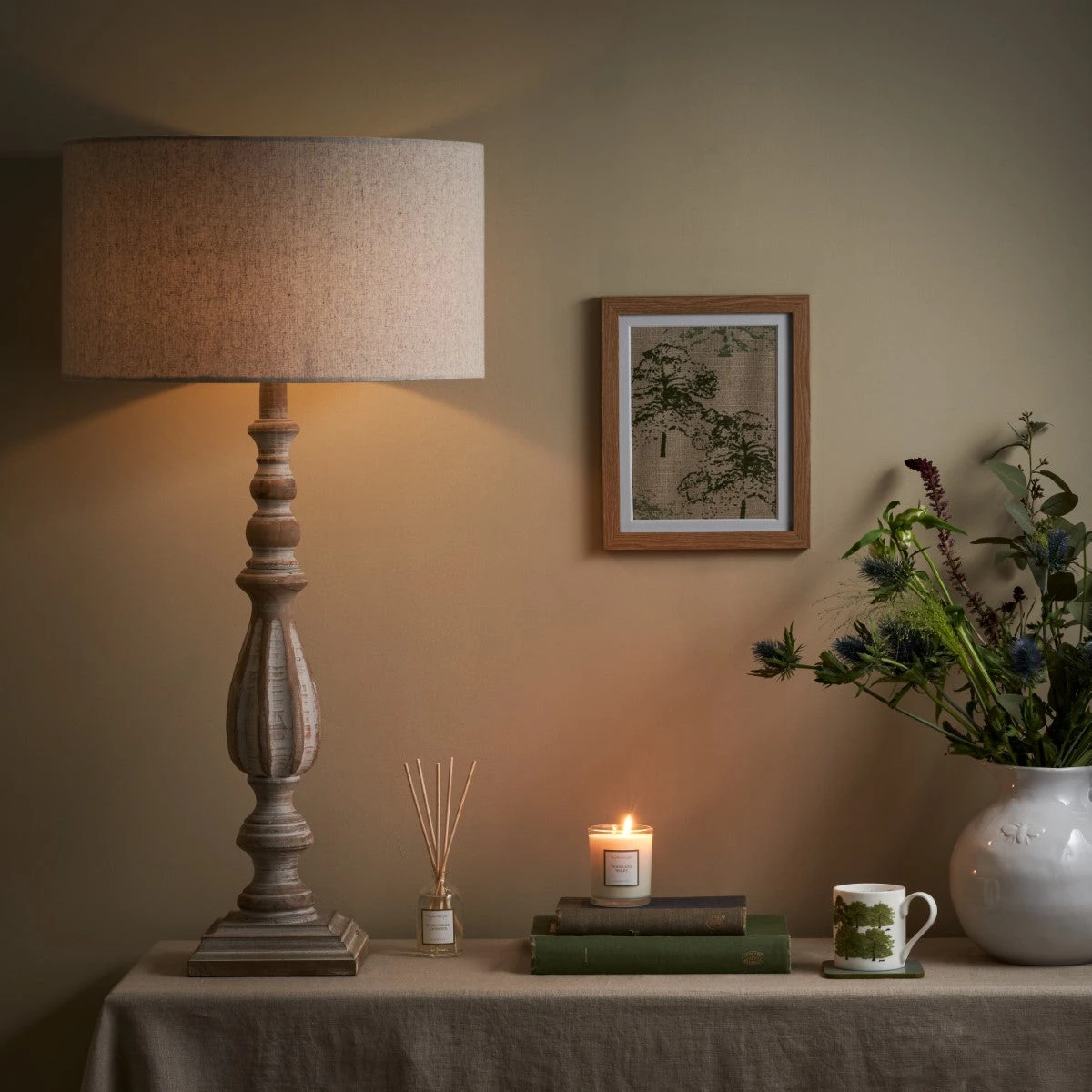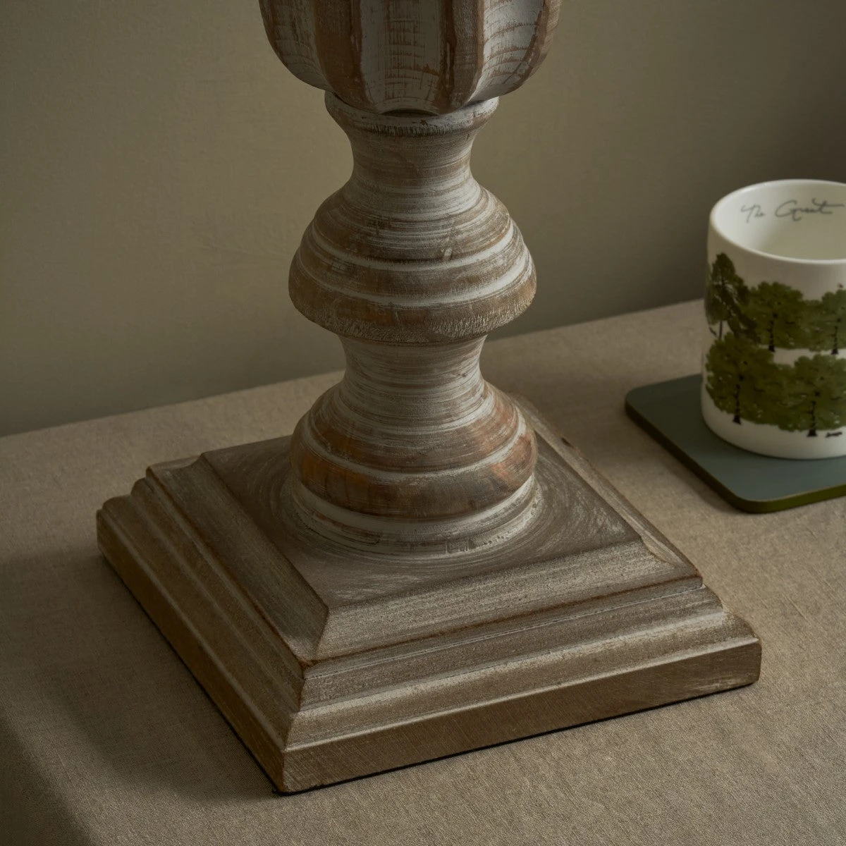 Drawing inspiration from the form of antique candlesticks, this Witham Carved Table Lamp boasts a beautifully carved vintage style turned base with a subtle whitewash finish, complimented by a taupe linen blend shade. Offering an understated elegant lighting solution, the lamp exhibits rustic charm and is the perfect choice to position on your bedside table, console table or by your favourite chair for a cosy reading nook.