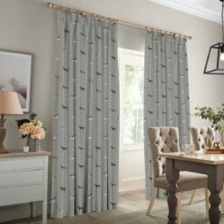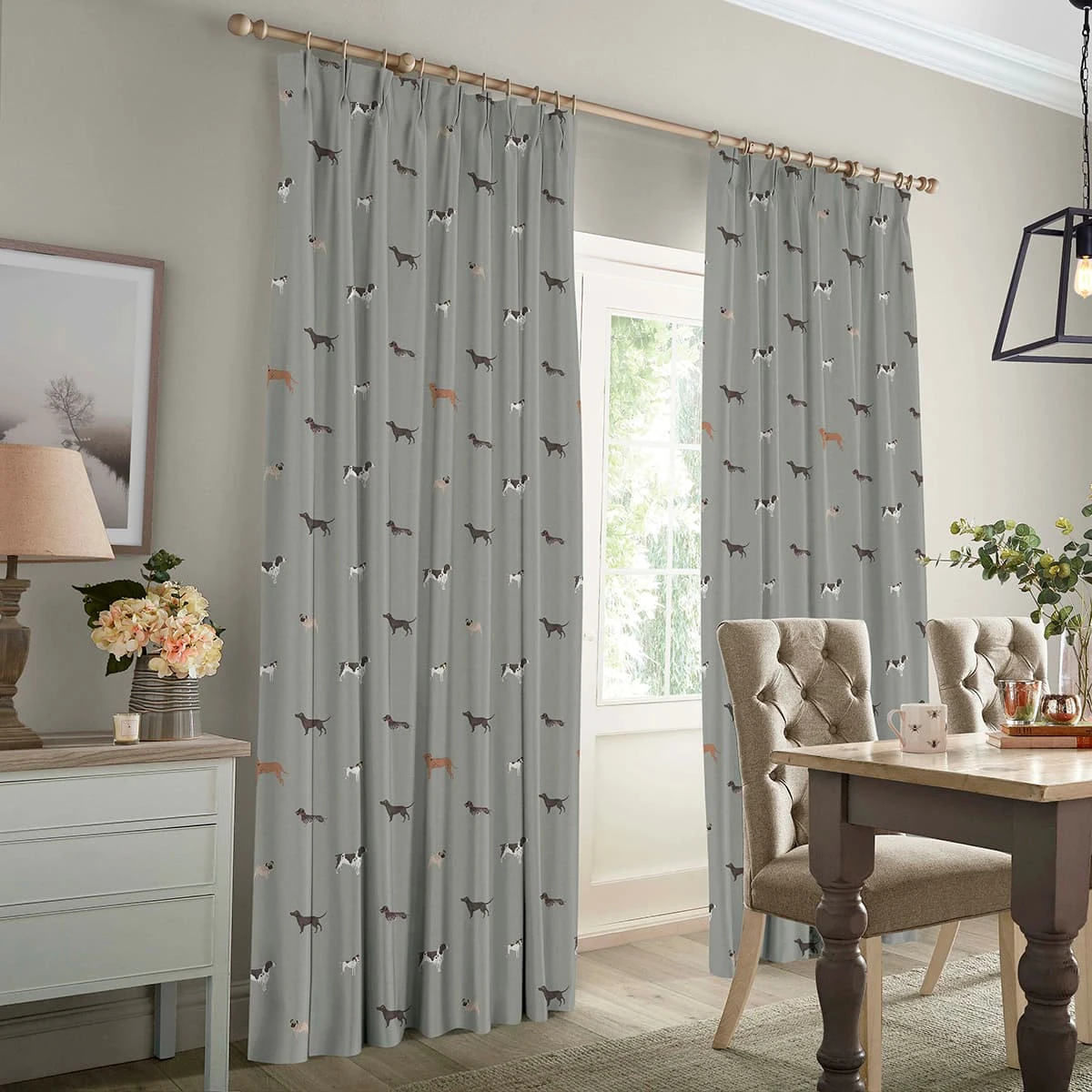 Perfect for dog owners, these lovely curtains are covered in Sophie’s woof print featuring illustrations of wire haired dachshunds, springer spaniels, cocker spaniels, pugs, jack russells, and fox red labradors on a sage ground colour. A pawfect touch to any home and excellent for adding texture and comfort to living rooms, dining rooms, bedrooms, offices, and hallways.Â