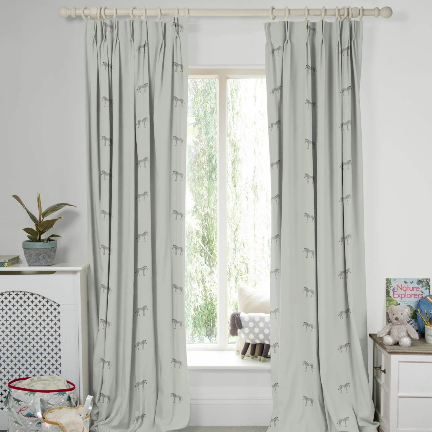 A beautiful addition to any home interior, these made to measure curtains feature Grevy’s zebras on a linen coloured background. Each zebra is patterned with distinctive black and white stripes and a pop of colour on each tail, including mustard yellow, teal blue and a beautiful coral pink.