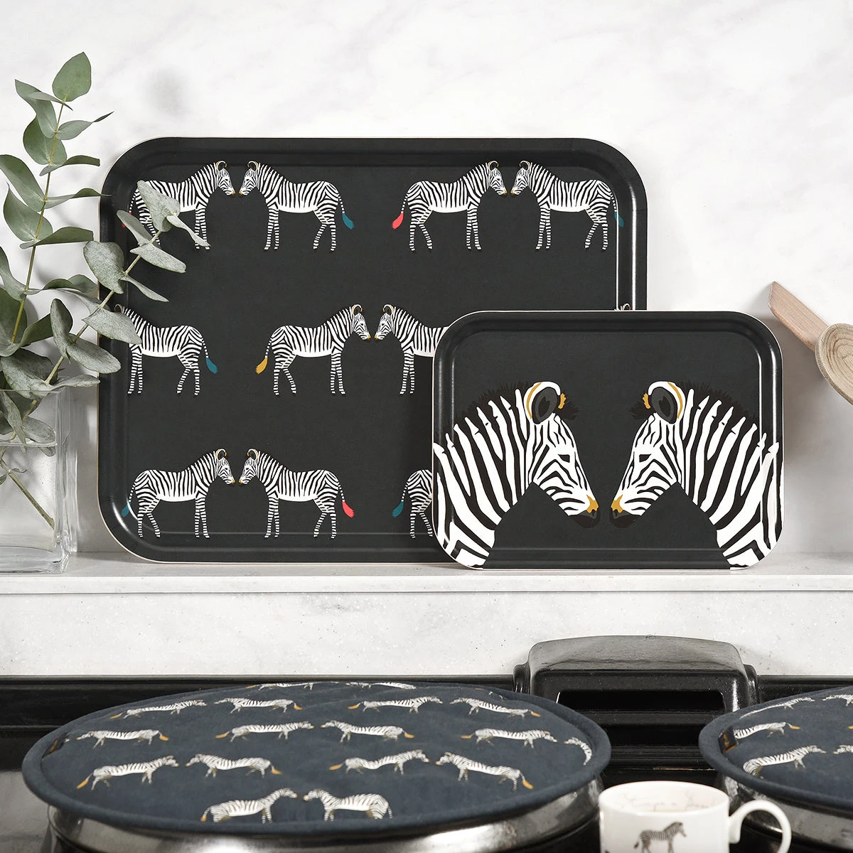 This stylish handmade small printed tray features two endangered Grévy’s zebras which are patterned with distinctive black and white stripes and bursts of mustard yellow on a navy charcoal background.Â